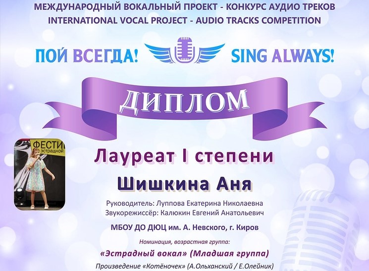 Юная кировская певица в заочном творческом состязании с конкурсантами из многих регионов России, Белоруссии, а также из других стран СНГ стала лауреатом I степени в престижной номинации «Эстрадный вокал» в младшей возрастной группе. Кировчанка талантливо и вдохновенно исполнила песню Алексея Ольханского на слова Елены Олейник «Котёночек».