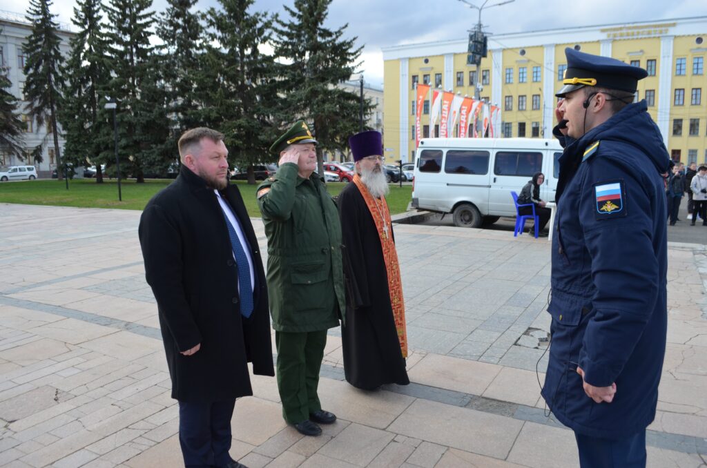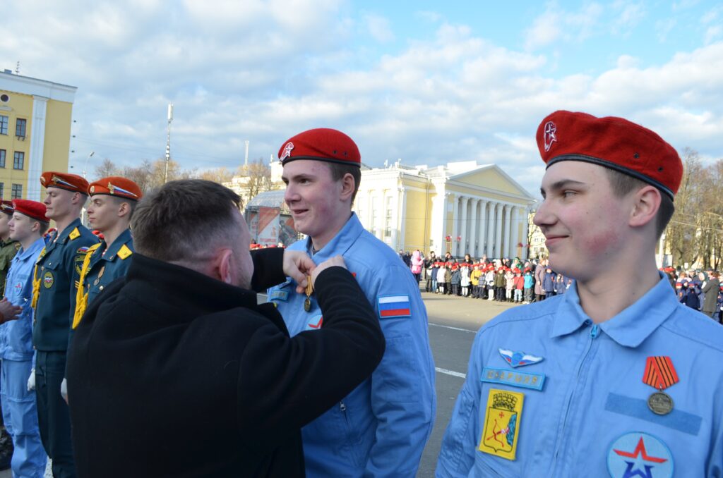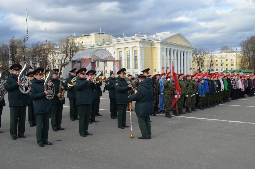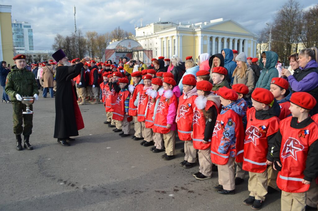 Детско-юношеский центр имени Александра Невского при поддержке городской администрации, департамента образования, войсковых частей, Вятской епархии провёл на Театральной площади Кирова традиционную весеннюю церемонию посвящения школьников в члены Юнармии.