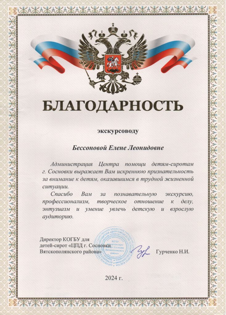 Елена Леонидовна – аттестованный экскурсовод Кировской области, проводит увлекательнейшие экскурсии по нашему городу, по Кировской области, в выставочном зале «Крестьянская изба» для экскурсантов разных возрастов.